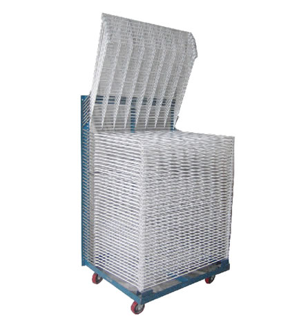 | 千层架,又叫丝印千层架、乾燥架、千层车、晾晒架、晾纸架、网架、层架台车。适用于印刷、上胶、喷漆、上色,溅镀後的晾乾置放器材。活动式多层网格设计,置放空间大,操作方便,节省车间、库房面积,并可适用於所放产品的常温晾乾和进焗炉高温烘烤。